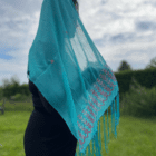 Lad dig forføre af elegance og historisk håndværk med vores chiffon tørklæde, håndbroderet af kvinder i Betlehem. Dette tørklæde er ikke blot et tilbehør, men en fortælling vævet af generationers arv.