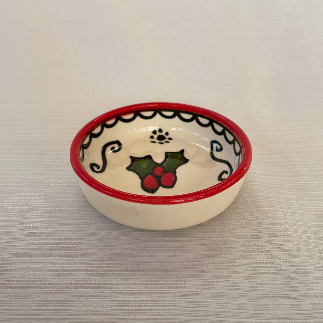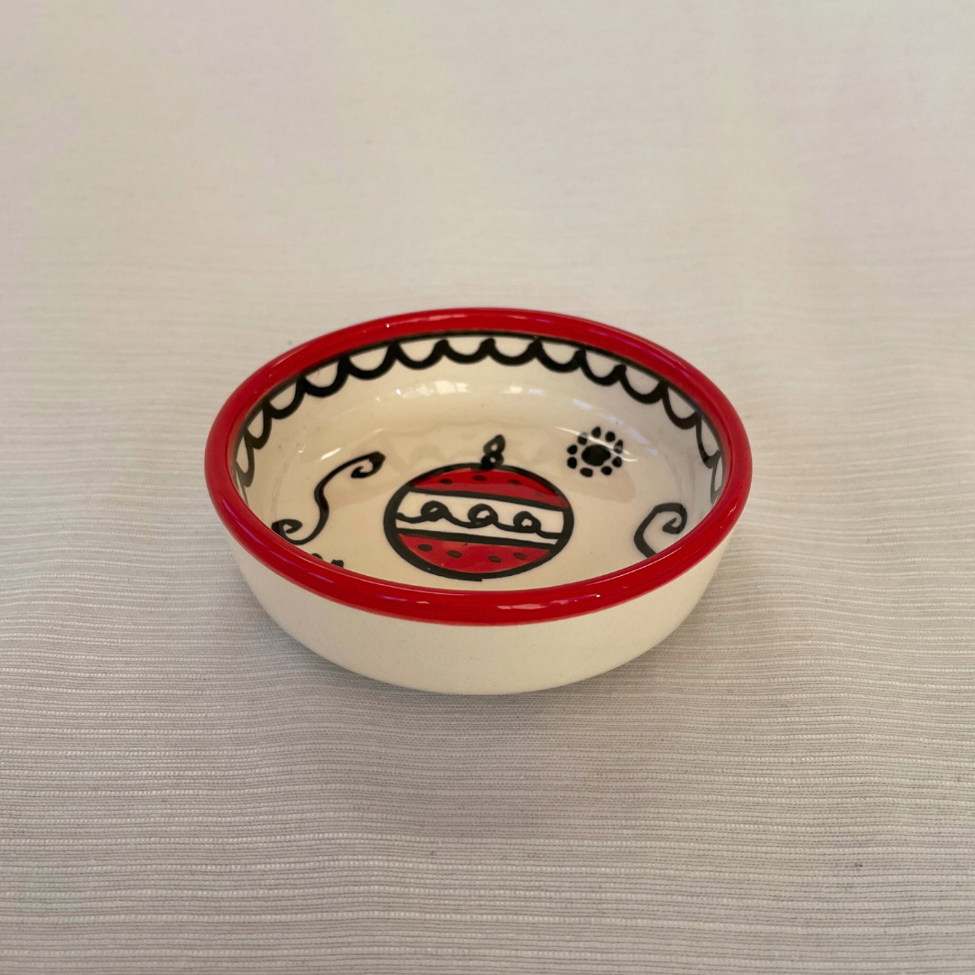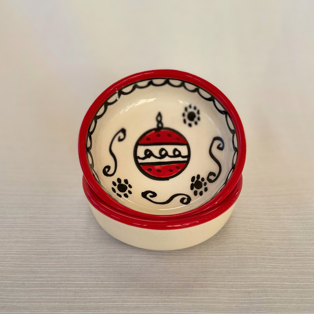 De små juleskåle er perfekte til julens hyggestunder. De er håndlavet og håndmalet i Al-Khalil / Hebron. Al-Khalil / Hebron er centrum for palæstinensisk keramikproduktion, en traditionelt håndværk med en historie på mere end 400 år, som blev blev initieret af osmannerne, der brugte keramik til at restaurere al-Aqsa-moskeen i Jerusalem.