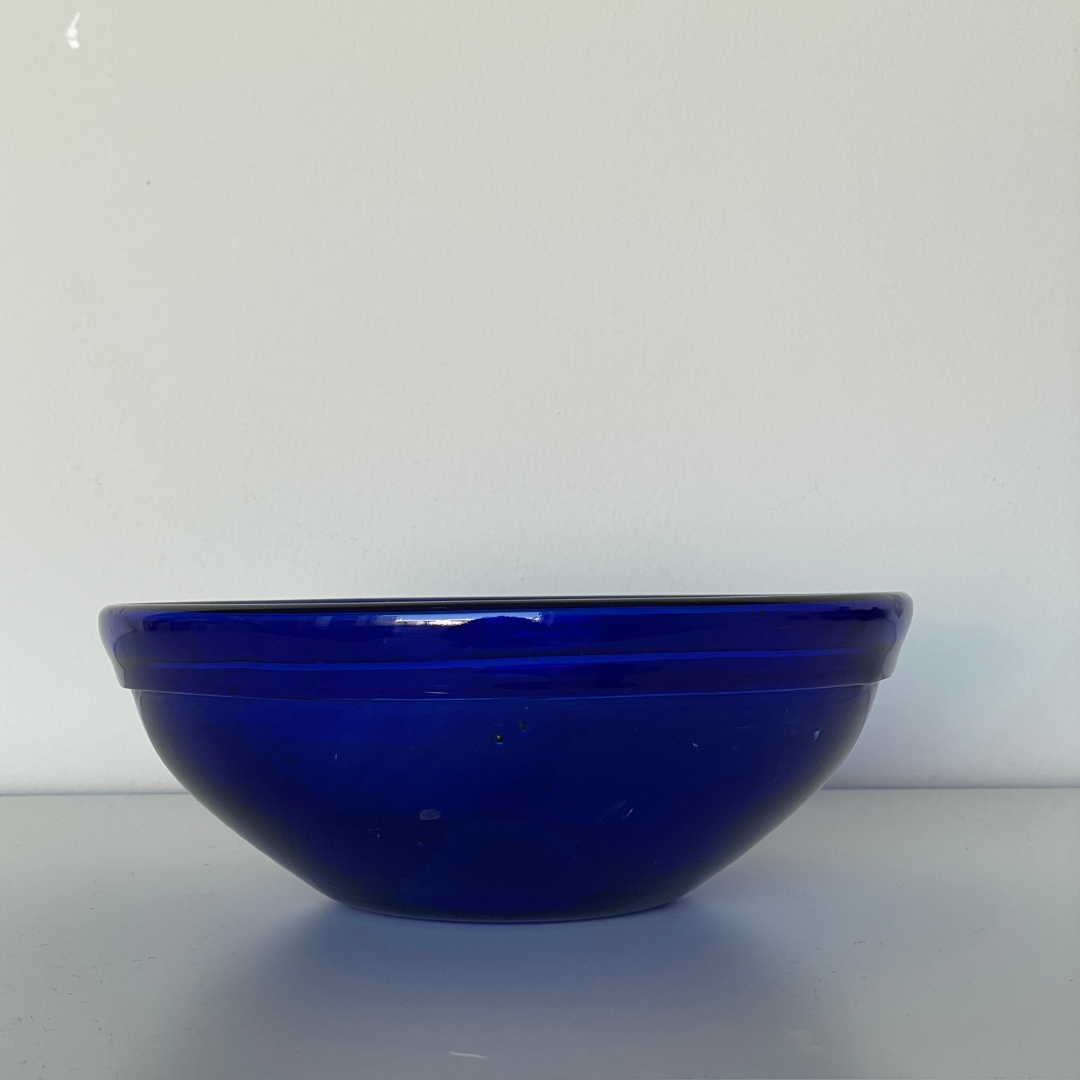 Oplev skønheden og håndværket i denne unikke, mundblæste glasskål fra Al-Khalil / Hebron. Skålen er skabt af dygtige håndværkere og fremstillet af genbrugsglas, hvilket gør den bæredygtig.