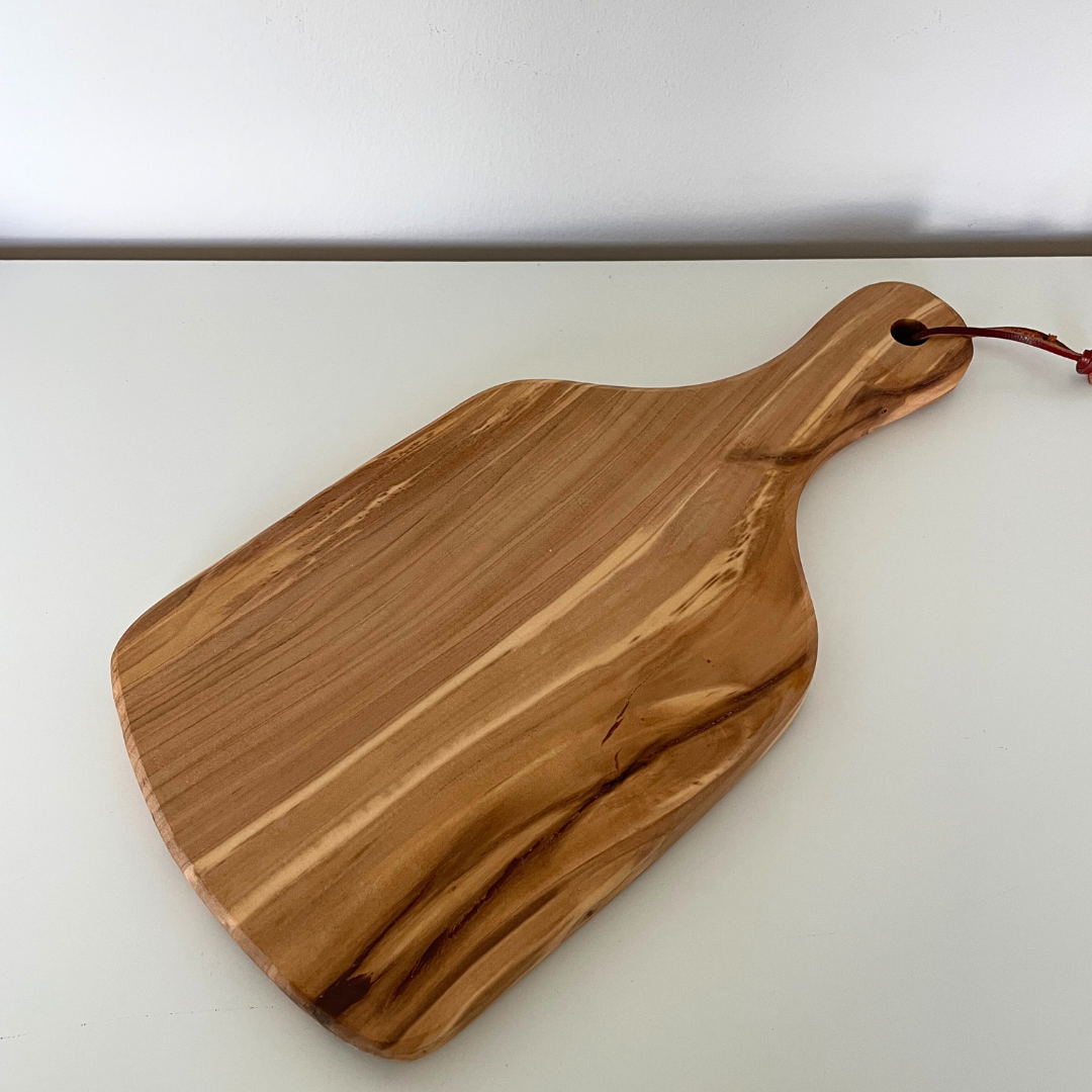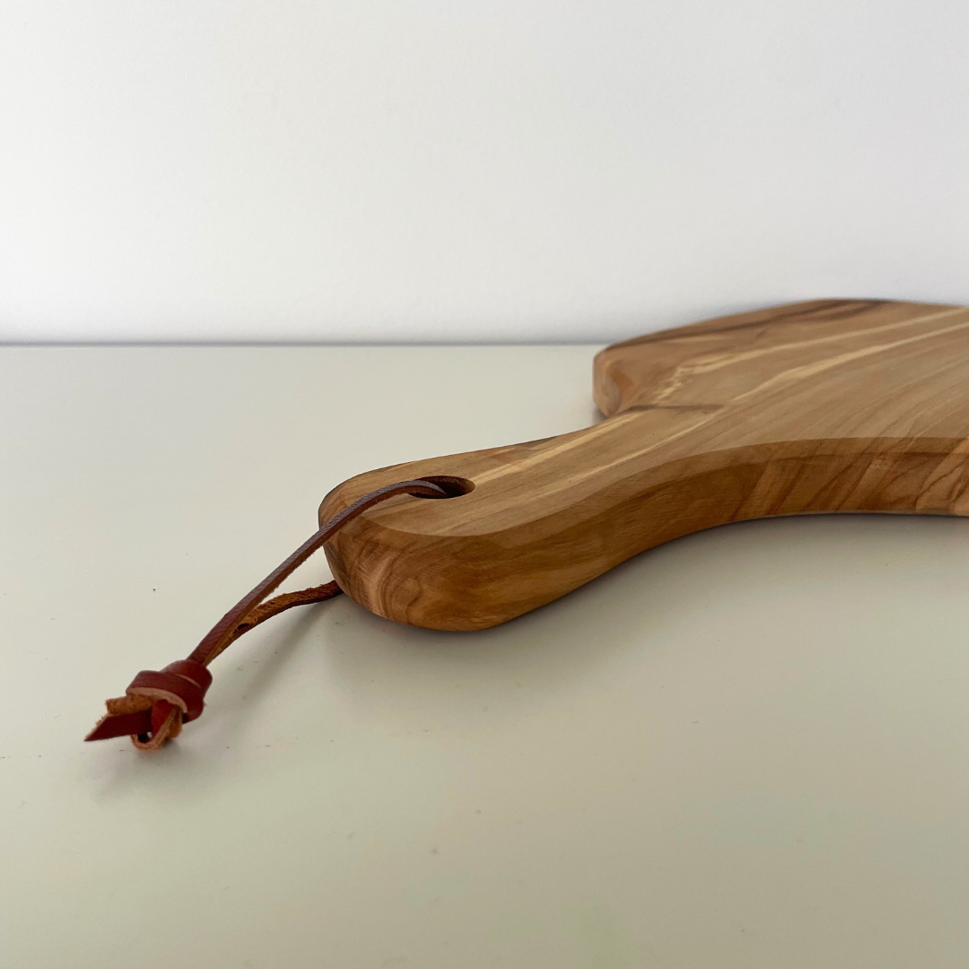 Dette smukke skærebræt / serveringsbræt er håndlavet i Betlehem af lokalt oliventræ; et materiale kendt for sin holdbarhed, smukke åremønstre og naturlige antibakterielle egenskaber. Med en blød, organisk form og en lædersnor til ophængning, er brættet både praktisk og æstetisk. Det kan bruges som både skærebræt og anretnings-/serveringsfad fx til servering af brød, tapas eller lignende.